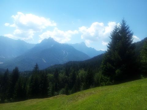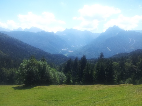 Ausblick zu den Julischen Alpen | Saftige Almwiese mit verblühten Enzian |